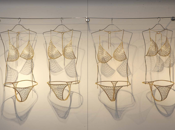 No One Home is a solo exhibition of installations, drawings, and video artwork by eminent artist Tayeba Begum Lipi. The exhibition presents a series of objects of women's daily life made of safety pins and stainless razor blades: heeled shoes, handbags, a sewing machine, and a bathtub - displayed in a gallery space, these personal objects create a feeling of hollow intimacy for their owner, who is nowhere to be seen. The viewer is left with the strange impression of peering through an empty apartment: the lights are on, but no one is home. The use of stainless steel razor blades has been a long-standing practice for the artist and has become, over the years, her signature technique. In a witty endeavor, Tayeba Begum Lipi assembles artworks with sharp material originally conceived to cut and tear apart. Although metallic blades are commonly associated with masculine use, the artist adds to the paradox by creating feminine and delicate objects. For Tayeba Begum Lipi, vivid childhood memories further associate razor blades with the feminine. Coming from a very large family where a newborn was frequently expected, she has clear recollections of blades being sanitized in boiling water and then used by mid-wives to separate the child from the mother. The blade thus becomes a symbol of women's strength and resilience. No One Home is a remarkably coherent exhibition in which artist Tayeba Begum Lipi continues to explore the themes that have long haunter her - the nature of womanhood, the place of women in society, the ephemeral nature of life - in a characteristically candid endeavor.